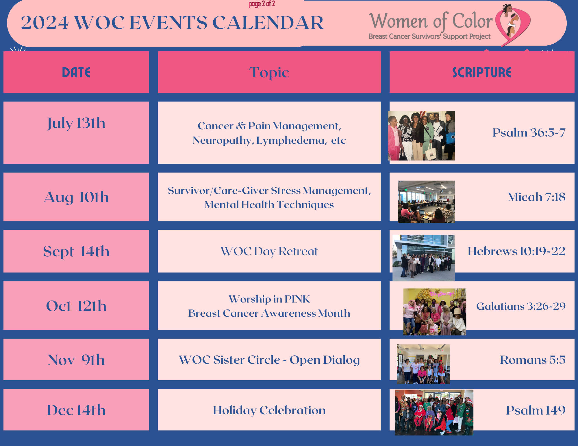 Highlights of the project include support groups, walking groups, kundalini yoga classes, Huladance, World dance, West African dance, Belly dance, meditation and journaling class, breast health seminars and nutrition seminars.